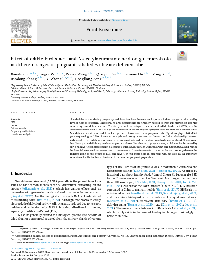 近年來,人們愈發(fā)關(guān)注腸道健康,越來越多的證據(jù)顯示,腸道菌群能夠通過產(chǎn)生菌群代謝產(chǎn)物、影響機(jī)體免疫反應(yīng)、調(diào)節(jié)迷走神經(jīng)及干預(yù)腸內(nèi)分泌系統(tǒng)等多種途徑和神經(jīng)系統(tǒng)相互作用。基于此,燕之屋聯(lián)合各大高校持續(xù)對(duì)食用燕窩的有益作用展開深入研究。今年1月,燕之屋關(guān)于“Effect of edible bird’s nest and N-acetylneuraminic acid on gut microbiota in different stages of pregnant rats fed with zinc deficient diet(食用燕窩和N-乙酰神經(jīng)氨酸對(duì)低鋅飲食孕鼠不同時(shí)期腸道菌群的影響)”的研究成果被食品科學(xué)領(lǐng)域國(guó)際知名SCI期刊《Food Bioscience》收錄。