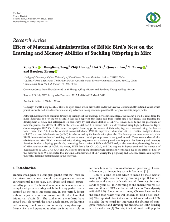 早在2018年3月,燕之屋關(guān)于“Effect of Maternal Administration of Edible Bird’s Nest on the Learning and Memory Abilities of Suckling Offspring in Mice(母鼠食用燕窩對(duì)子代學(xué)習(xí)記憶能力的影響)”的研究成果就登上了食品科學(xué)領(lǐng)域國(guó)際知名SCI期刊《Neural Plasticity》。研究結(jié)果表明,食用燕窩提升了子代腦內(nèi)海馬體中CA1,CA2和CA3區(qū)域的BDNF(一種神經(jīng)營(yíng)養(yǎng)因子)水平及CA1,CA2,CA3和DG區(qū)域的染色神經(jīng)元數(shù)量,這標(biāo)志著子代學(xué)習(xí)記憶能力的提升。該項(xiàng)研究推測(cè)食用燕窩通過增強(qiáng)超氧化物歧化酶和膽堿乙酰轉(zhuǎn)移酶的活性,同時(shí)降低腦內(nèi)丙二醛的水平和乙酰膽堿酯酶活性,來緩解氧化應(yīng)激損傷、改善子代的學(xué)習(xí)記憶能力,是業(yè)界首次揭示母體食用燕窩對(duì)改善子代學(xué)習(xí)記憶能力的作用及機(jī)制的研究。